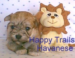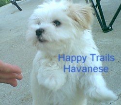 ![]() ![]() Judy and her beautiful irish pied havanese boy, Bandit. What a gorgeous little havanese boy :), thanks so much for sharing Judy ! Easy to see that havanese LOVE their owners, unconditionally ! Last photo above is a red irish pied havanese girl named Sadie, she can be seen on the puppies for sale page . ![]() Buddy a dark sable havanese after he has settled in with his family in New Jersey. For more geat havanese photo's see our puppies for sale page We can help you find that havanese puppy to love and call yor very own. Happiness is a havanese puppy. ![]() ![]() ![]() Here at Happy Trails Havanese we do everything possible to breed for the healthiest havanese dogs and havanese puppies you will find anywhere. We do our genetic health testing at Iowa State University to eliminate any potential problems from my havanese bloodlines. Please check our genetic health testing link to learn more about what health testing is and to see actual photographs of the testing being done. ![]() ![]() ![]() ![]() Our most famous havanese dog, Billy he will be attending the AKC Eukanuba Dog Show in December of 2007. We are so proud of Billy, with him winning many Best in Show as well as many group placements. Billy has done so well he has qualified for the Eukanuba in just 8 months. He is a beautiful specimen of a havanese and is available for stud service. Check out Billy's page for more great photo's. ![]() ![]() ![]() For more great pictures of havanese puppies available, feel free to call me (Marlene) at 1-712-592-3525 or top of page email me (Marlene) at Marlene@https://happy-havanese.com